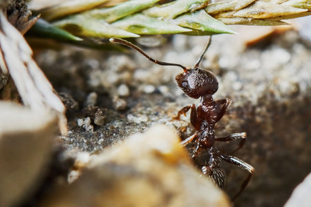 A detailed shot captures a lone crimson ant tread carefully on a sleek surface, amid scattered minuscule debris, with softly blurred companions in a gentle natural glow.