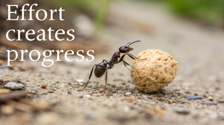 A tenacious ant strains to push a substantial ball across a textured, earthy surface, showcasing incredible strength and perseverance, perfect for inspiring hard work and overcoming challenges.