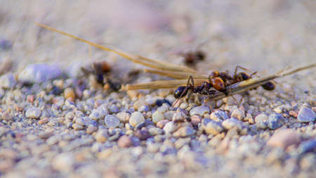 Ants on the ground in the autumn forest. Macro shot.
