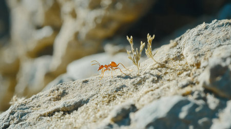 A close-up shot of a bright orange ant moving along a rocky surface with a small plant nearby, showcasing the intricate details of nature and insect life.