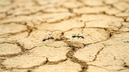 This image features two ants navigating a dry, cracked soil surface, highlighting the struggles of wildlife in arid environments. The intricate details of the soil texture complement the ants' journey for survival.