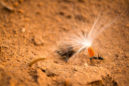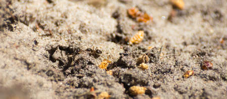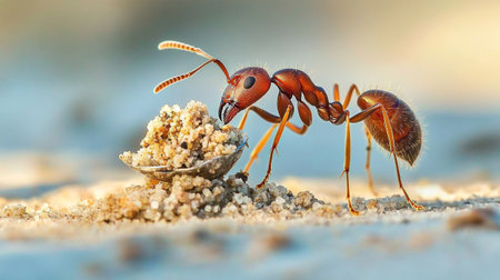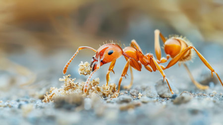 Detailed macro shot of an ant transporting food to the anthill for storage purposes