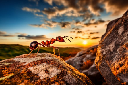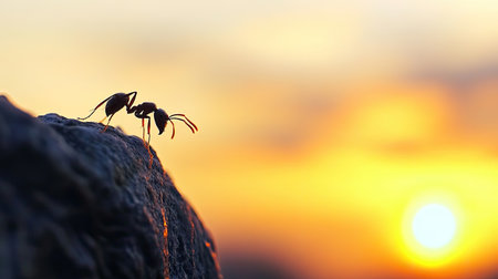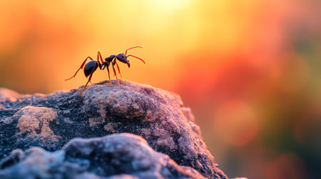 Ant climbing over rocky surface at sunset with colorful bokeh background. Determination and perseverance in nature concept