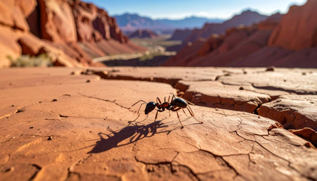 In the immense, sun-scorched expanse of a red rock canyon, a single ant embarks on a determined journey.
