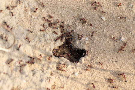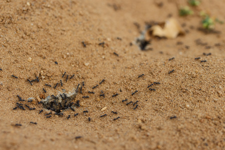 group of black ants on sandy background