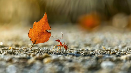 A close-up view of a tiny ant carrying an autumn leaf on a paved surface, showcasing intricate details of nature, vibrant colors, and seasonal beauty.