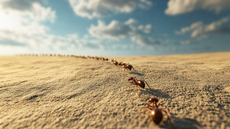 A line of ants marching across a sandy surface with a large area of empty sky above for text.