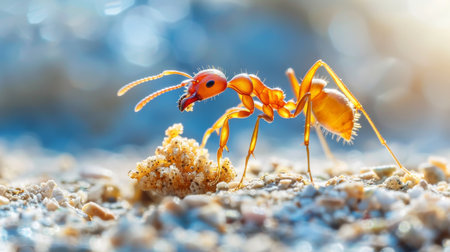 A macro shot of a fiery red fire ant carrying a food crumb back to its nest