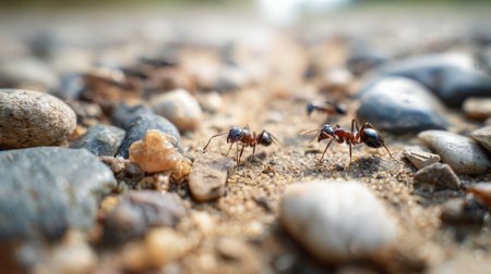 This close-up image captures ants diligently crawling on sandy ground amidst small pebbles, showcasing their details and interaction with the environment.