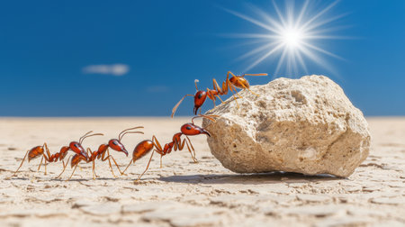 A captivating image of ants working together to move a rock in a sunlit desert environment, showcasing the power of teamwork and determination in nature's intricate design.
