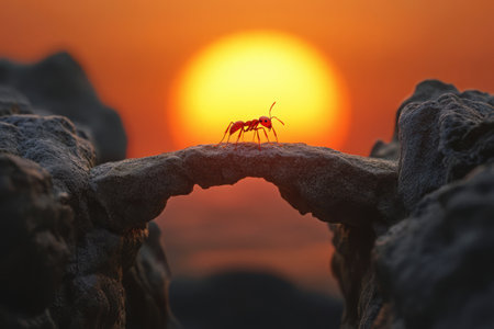 A captivating image of an ant silhouetted on a rock, set against a breathtaking sunset sky. The vibrant colors of the evening sky create a stunning backdrop, showcasing nature's beauty.