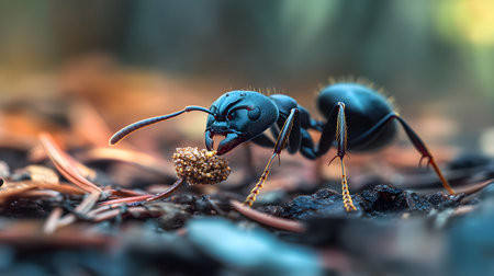 A detailed macro shot of an ant carrying food to its colony, illustrating the foraging behavior and industrious nature of these small creatures