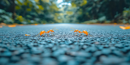 Two Orange Ants Facing Each Other on Asphalt Road Nature Closeup