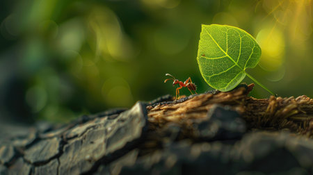 An ant navigates a challenging journey, transporting an oversized leaf across a rugged log, showcasing nature's resilience