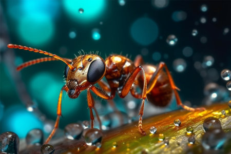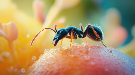 Macro shot of an ant carrying a water drop on a flower. Nature wildlife photography of the small insect in detail with soft focus background. A miniature world of colors and blooms in nature's art