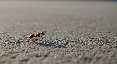 A close-up, low-angle shot of a single ant walking across a textured grey paved surface. The lighting creates a long shadow, highlighting the insect's silhouette and legs against the ground.