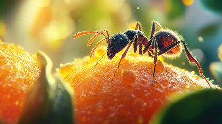 A high-quality image of an ant exploring a piece of fruit, with close-up detail of its antennae and legs, and a blurred background of the fruit.