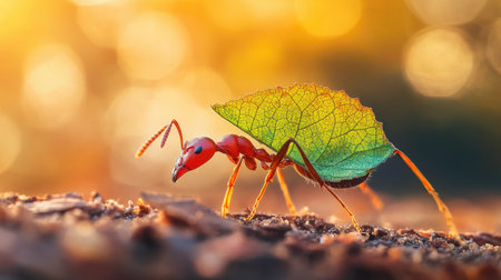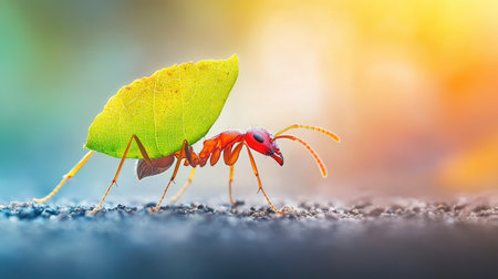 A vibrant leafcutter ant carries a green leaf in a beautifully blurred background. Discover the intricate details of nature's small wonders in this macro shot.
