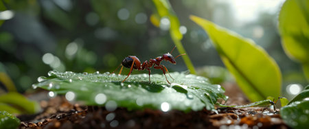 Close-up of an ant on a leaf with water droplets