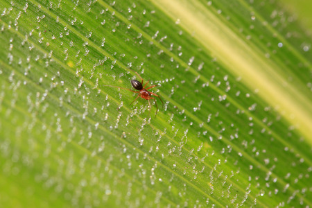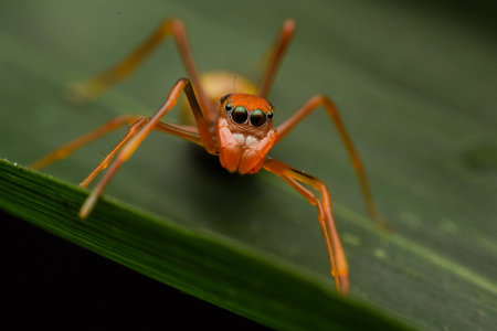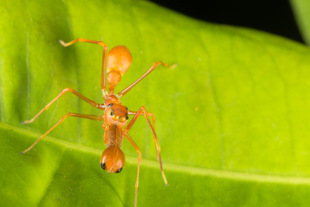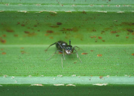 A Myrmaplata plataleoides or Red weaver-ant mimicking Jumper spider on green leaf, Macro photo in Thailand.