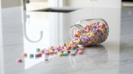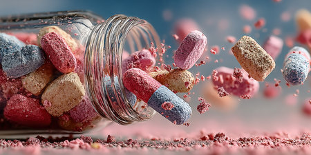 Colorful capsules are spilling from a glass jar onto a soft pastel surface, highlighting vibrant colors and textures, symbolizing health and wellness in a creative way