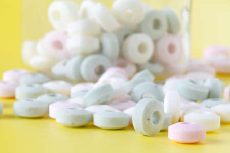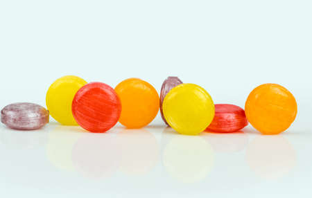 Medical lozenges for relief cough, sore throat and throat irritation isolated on white background. Cough and colds drop. Colorful cough pastille. Red, orange, yellow, and purple round candy or sweets.