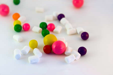 Pink, violet, purple, red, green, yellow, orange round candies with white marshmallows on a white background. Selective focus
