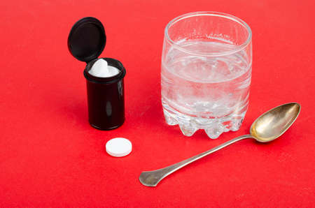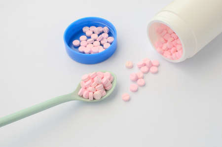 Pink medicine tablet on the spoon and open bottle of medicine on white background