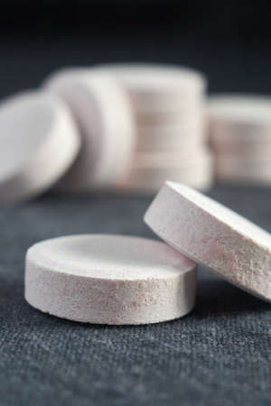 stack white pills on black textile background. medical pharmacy