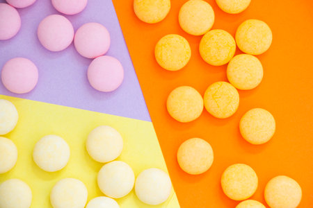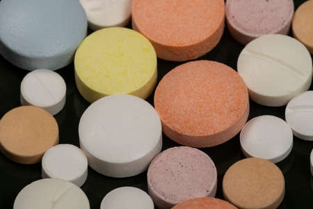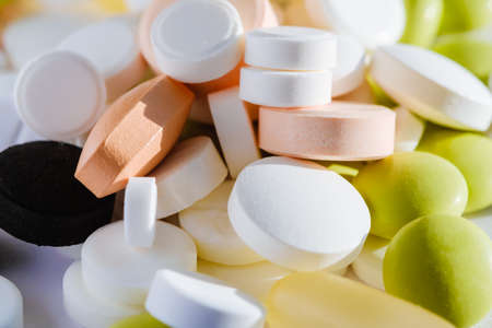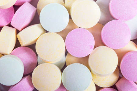 colorful pills and tablets on background.