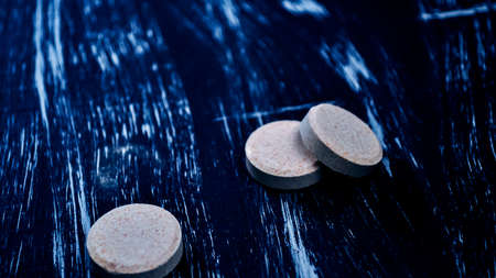 A lot of white, black and grey tablets lie on the blue surface. Background image on medical and pharmaceutical topics