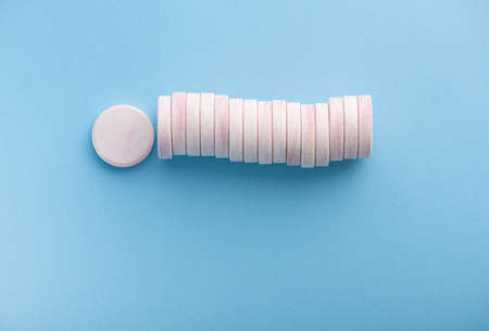 effervescent tablets on pastel blue background, top view, copy space
