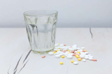 Colorful medical pills with a glass of water on the table, for your text