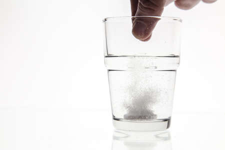 Effervescent tablet of pharmaceutical product held by the fingers above a glass of water on a light background