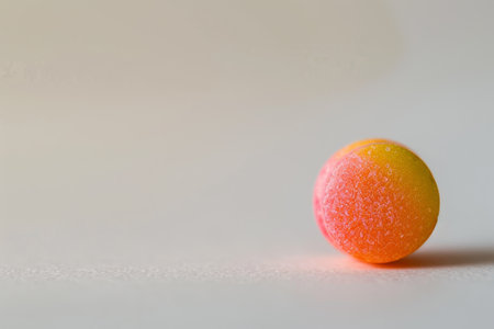 A small orange and yellow ball sits on a white surface. The ball is surrounded by a white background, which creates a sense of emptiness and simplicity