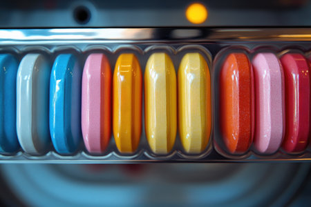 Close up image of colorful pills sitting in a blister pack moving along a conveyor belt in a medical factory