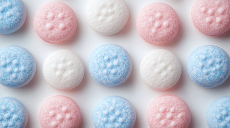 Various pastel colored candies are scattered on a flat surface displaying shades of pink blue yellow and green creating a vibrant visual appeal.