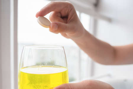 An ascorbic acid tablet in female hand and glass of water.