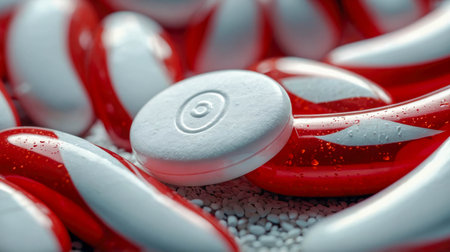 A red and white capsule pill resting on a reflective surface, symbolizing medicine and healthcare.