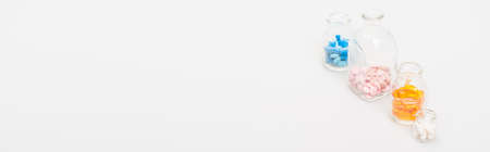 panoramic shot of colorful pills in glass bottles on white background