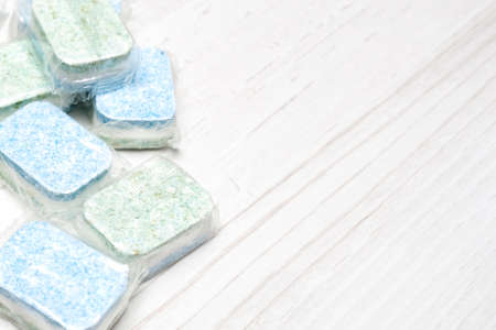 Green and blue dishwasher tablets in water-soluble packaging close up on the table with copy space