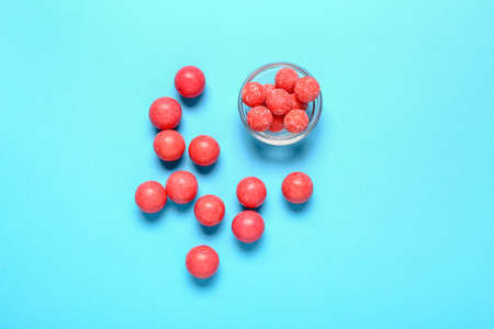 Bright blue and pink colorful candies scattered on red textured background front view