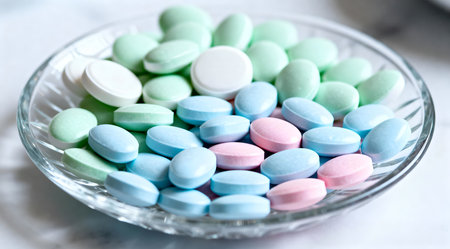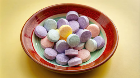 A selection of colorful mints and pastilles displayed in a transparent glass dish, captured from an overhead perspective. The soft lighting enhances the cool and refreshing appearance of the candies, showcasing a variety of shapes including round, oval, and square. This image could be used in culinary publications or as a visual element in health and wellness content. AI-generated illustration.