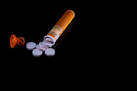 Selective focus on multivitamins effervescent tablets isolated on black. Bucharest, Romania, 2021
