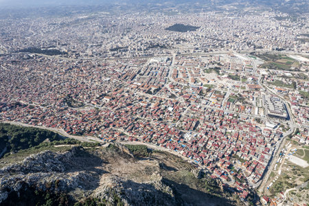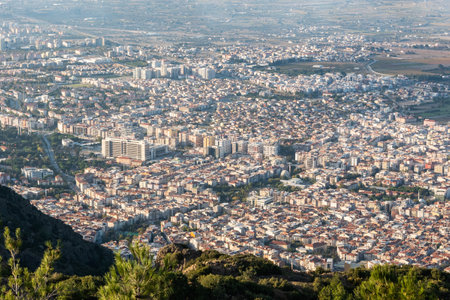 Manisa, Turkey – November 7, 2020. Aerial view over downtown Manisa town in Turkey. View with spurs of the Spil Dagi mountain.