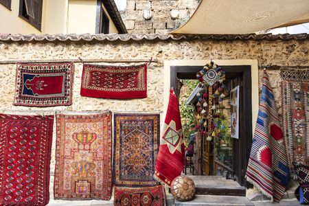Manavgat, Turkey - November 13, 2021: coastal street with stores and shops with goods for tourists in the historical area of Side