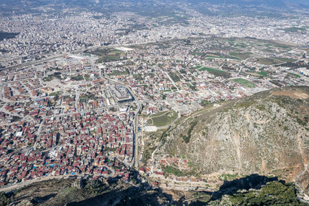Aerial photograph of Antalya bay in Antalya city from high point of drone fly on sunny day in Turkey.