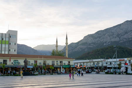 Kemer, Turkey - November 07, 2021: evening view of the mosque and Taurus mountains in the city center