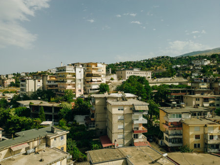 Gjirokaster town / Albania - August 2, 2020 - traditional white houses with stone gray roofs and modern buildings on the hill. Summer landscape with lush foliage, blue sky and mountains on the horizon.