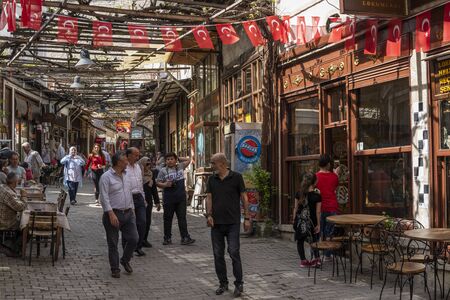 Safranbolu, Turkey - May 1, 2019: Touristic village with tourists shopping at one of the main streets with restaurants and cafes and with turkish flags.